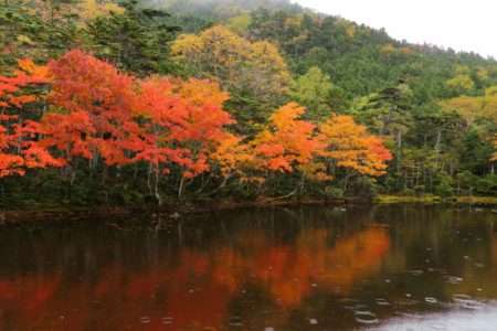 雨霧に包まれた七ッ池の紅葉は長持ちするだけでなく、色が冴えて美しさを増してくれるので私は大歓迎ですが、一般的には雨の山歩きを楽しない傾向となっています。